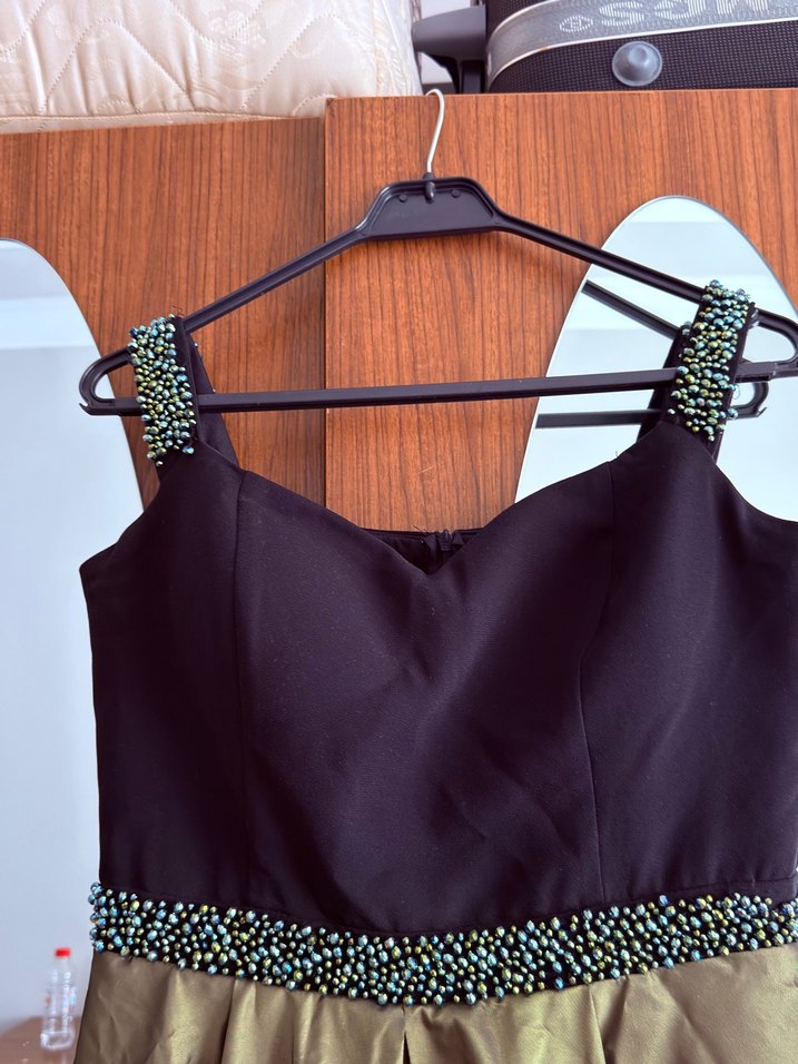 Bu siyah uzun abiye elbise, inci işlemeli askıları ve nakışlı deseniyle şık ve fit kesimlidir, partiler için uygundur. ✨sadece saatlik kullanıldı mağaza ürünüdür Prenses modeldir