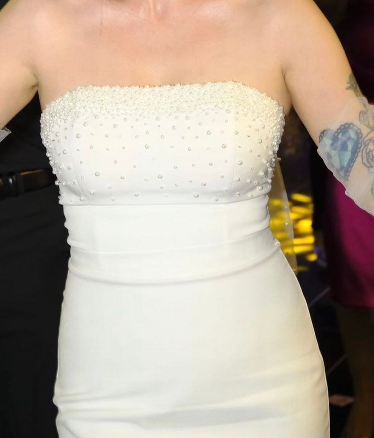 İnci işlemeli straplez beyaz abiye, vücuda oturan kesimi ve kolsuz tasarımıyla, modern ve göz alıcı bir görünüme sahiptir. ✨