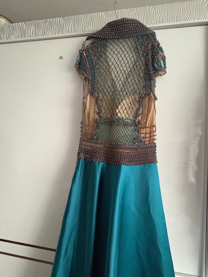Turkuaz renkli, straplez ve kolsuz bu abiye elbise, ince işlemeli boncuklu file detaylarıyla dikkat çeker. Uzun boyu ve sade etek kısmıyla düğünler için uygundur. ✨