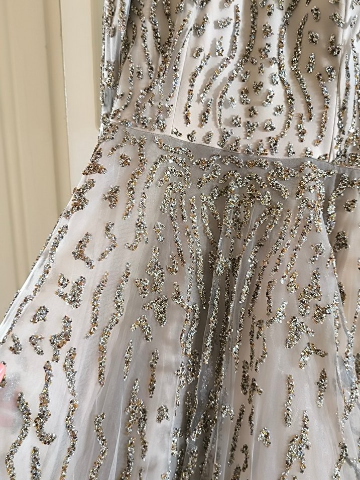 Uzun, vücuda oturan bu elbise, tekne yaka ve ince askılarla bezenmiş, gri ve bej tonlarında işlemeli payet detaylara sahiptir.
