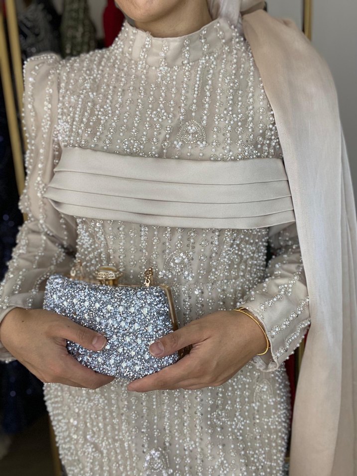 İnci İşlemeli Uzun Beyaz Abiye Elbise