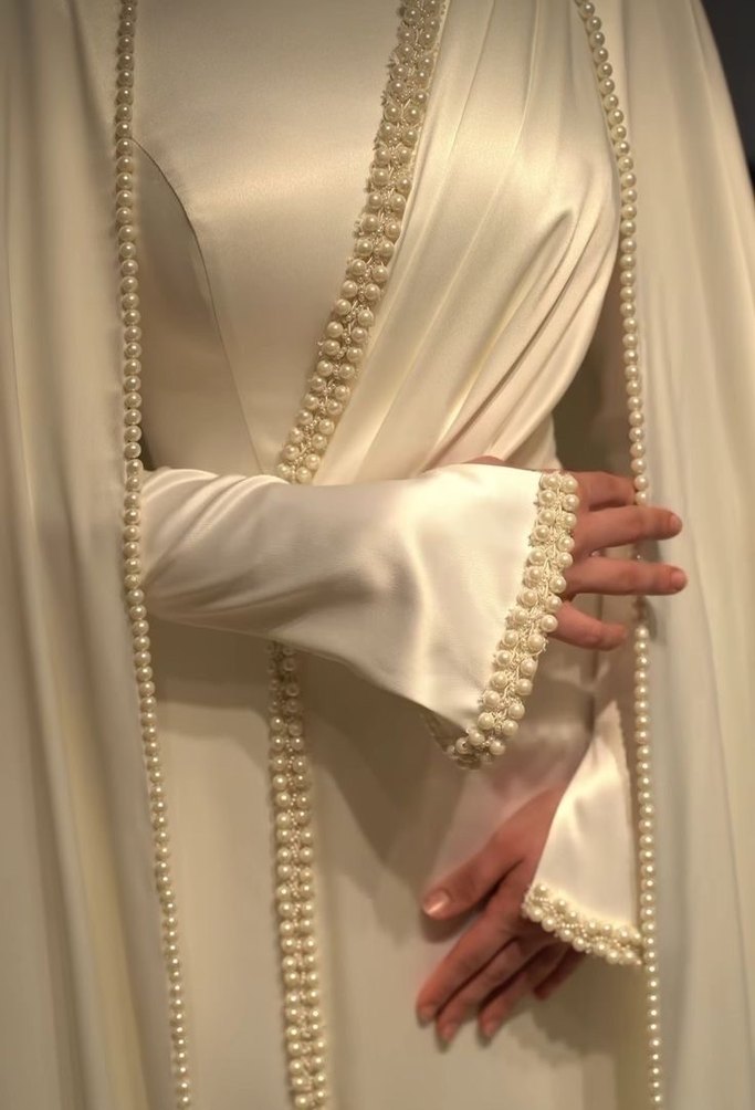 Uzun beyaz nişan elbisesi, yüksek yakalı ve ince askılıdır. Drapeli tasarımda inci işlemeleriyle şık ve parlak bir görünüm sunar. Kiralıktır