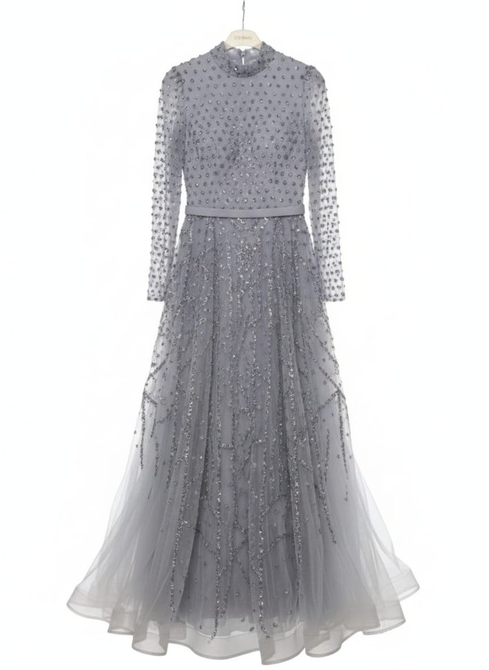 Yüksek yakalı, uzun kollu ve işlemeli incilerle süslenmiş gri uzun abiye elbise. Modern klasik ve gösterişli şıklığıyla düğünler için uygun. ✨
