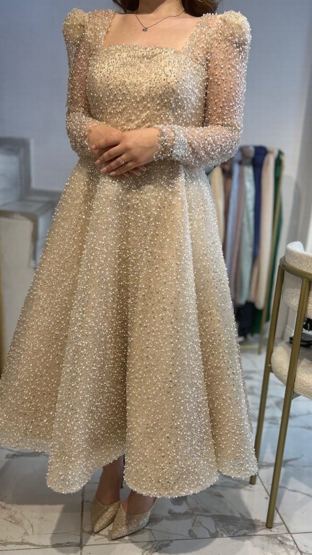 İnci İşlemeli Uzun Kollu Bej Nişan Elbisesi