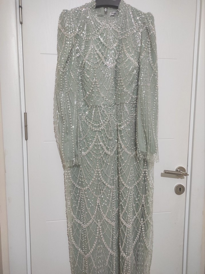Uzun kollu, yuvarlak yaka gri abiye elbise, inci işlemeleri ve nakış detaylarıyla süslenmiştir. Bohem tarzda, klasik şıklık sunar. ✨