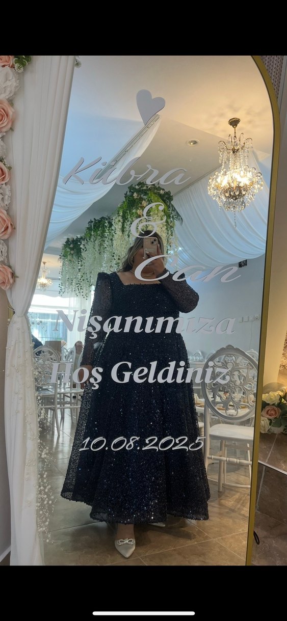 Midi boy , lacivert nişan elbisesi, kare yaka ve işlemeli tül uzun kollu. Boncuk ve işlemeli detaylar, parlak ve bohem bir havası var . Ürün hazır bir ürün değil kendim diktirdim herşeyiyle .