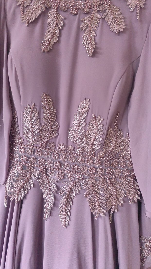 Uzun kol ve V yaka kesimli, mor renkli, ince işlemeli ve parlak boncuk detaylı klasik şıklıkta abiye elbise. ✨