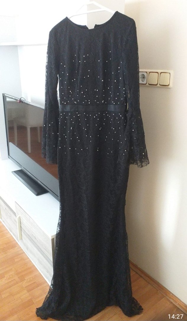 Uzun kollu, inci işlemeli ve tekne yaka detaylı siyah, vücuda oturan gotik tarzda abiye elbise. Düğün için klasik şıklık sunar.