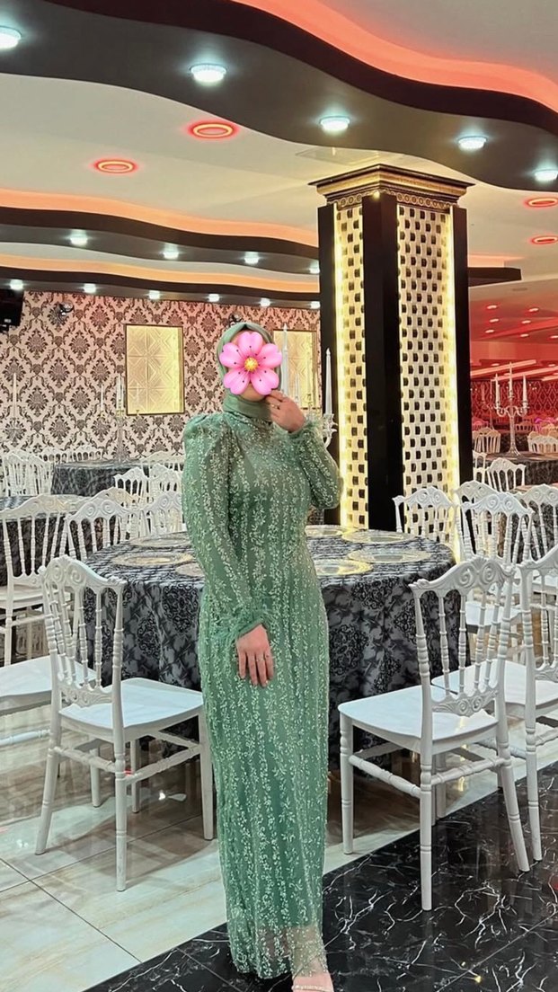 Yüksek yakalı, uzun kollu, ince kesim ve su yeşil tie-dye desenli inci işlemeli uzun abiye elbise. Hiç bir sorunu yok, bir kere kullanıldı ✨