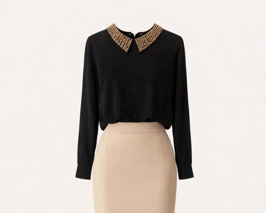 İnci İşlemeli Yakalı Siyah Kadın Gömlek