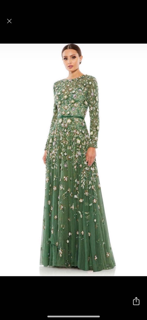 Yeşil uzun kollu, ince işlemeli çiçek desenli bol kesim elbise, bohem ve klasik zarafet stilinde, düğünler için uygundur.
