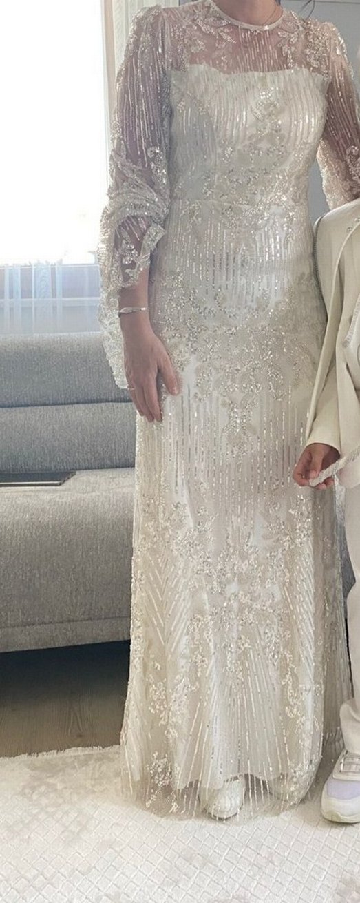 İnci İşlemeli yuvarlak Yaka Uzun Kollu ekru renk Abiye