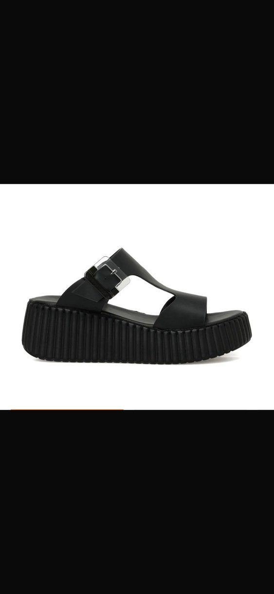 Kadınlar için siyah platform topuklu sandalet, tokalı kayış ve kalın kauçuk taban. Minimalist tasarım, goth ve avant-garde tarzlara uygundur.