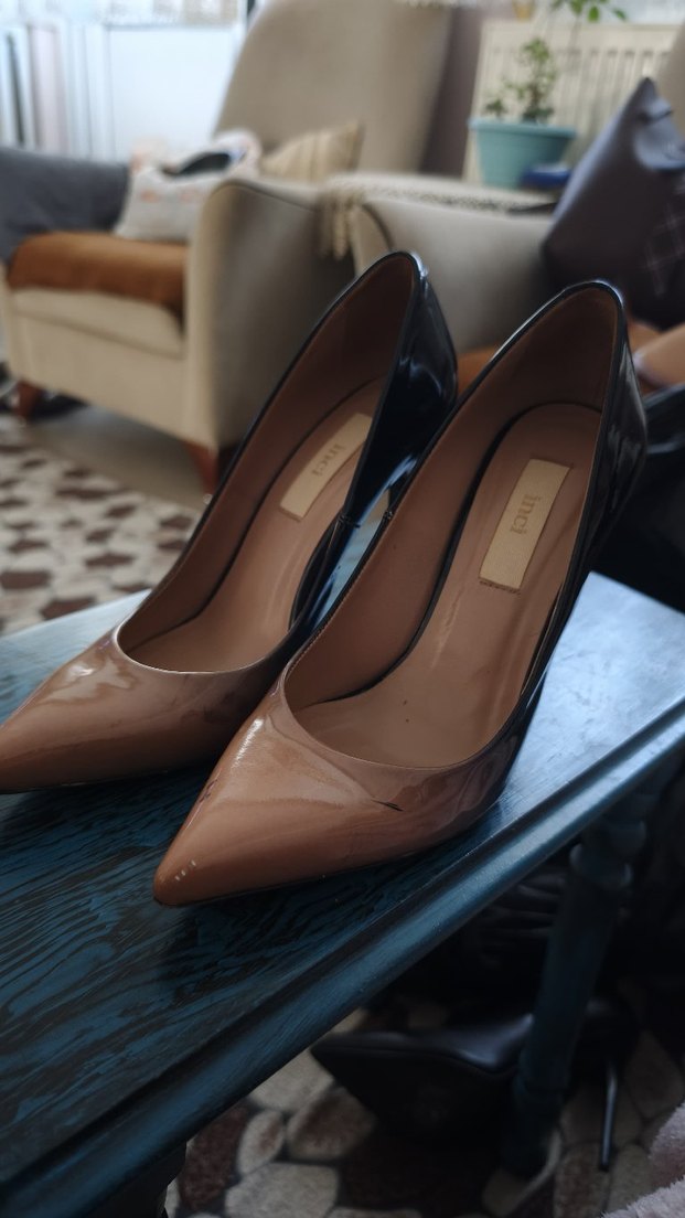 Bej renkte, tokalı ve sivri burunlu kadın stiletto iyi durumda