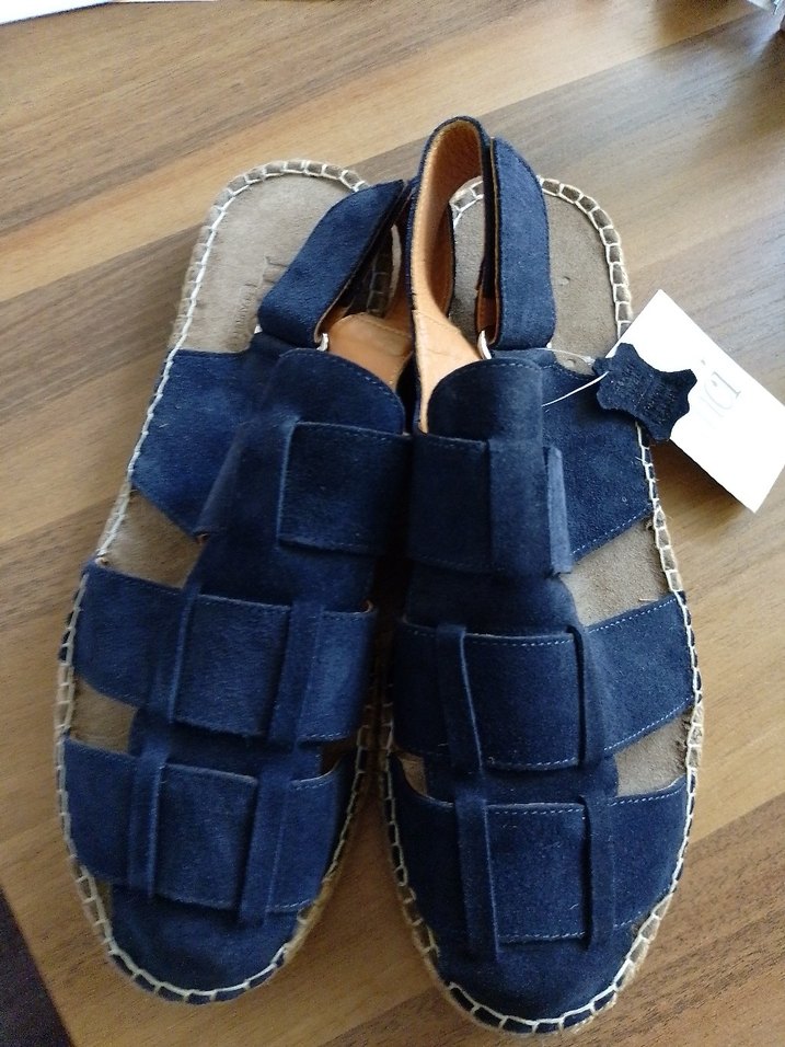 Mavi süet malzemeden üretilmiş, tokalı erkek sandalet. Günlük kullanıma uygun rahat ve bohem tarzda tasarlanmıştır.