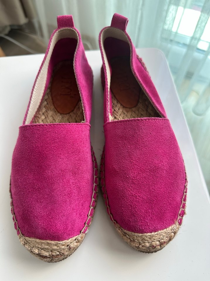 İnci Pembe süet espadril hiç kullanılmadı yenidir, sade renkli tasarımıyla zahmetsiz şıklık sunar. Günlük bohem tarz için uygundur.