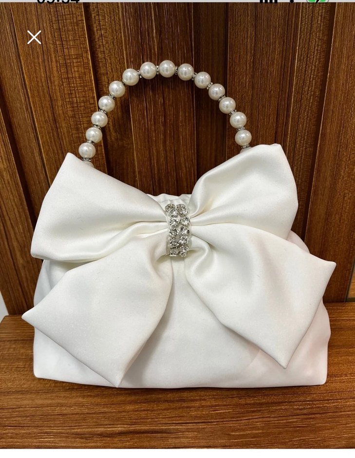 İnci Saplı Beyaz Fiyonklu Kadın Abiye Çanta Taşlı Gelin Çantası.