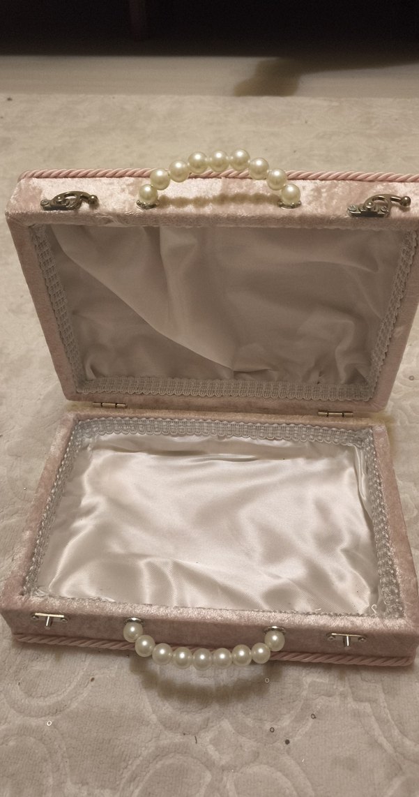 Parlak bej renkte, inci saplı ve yumuşak kumaş iç yüzeyli makyaj kutusu.