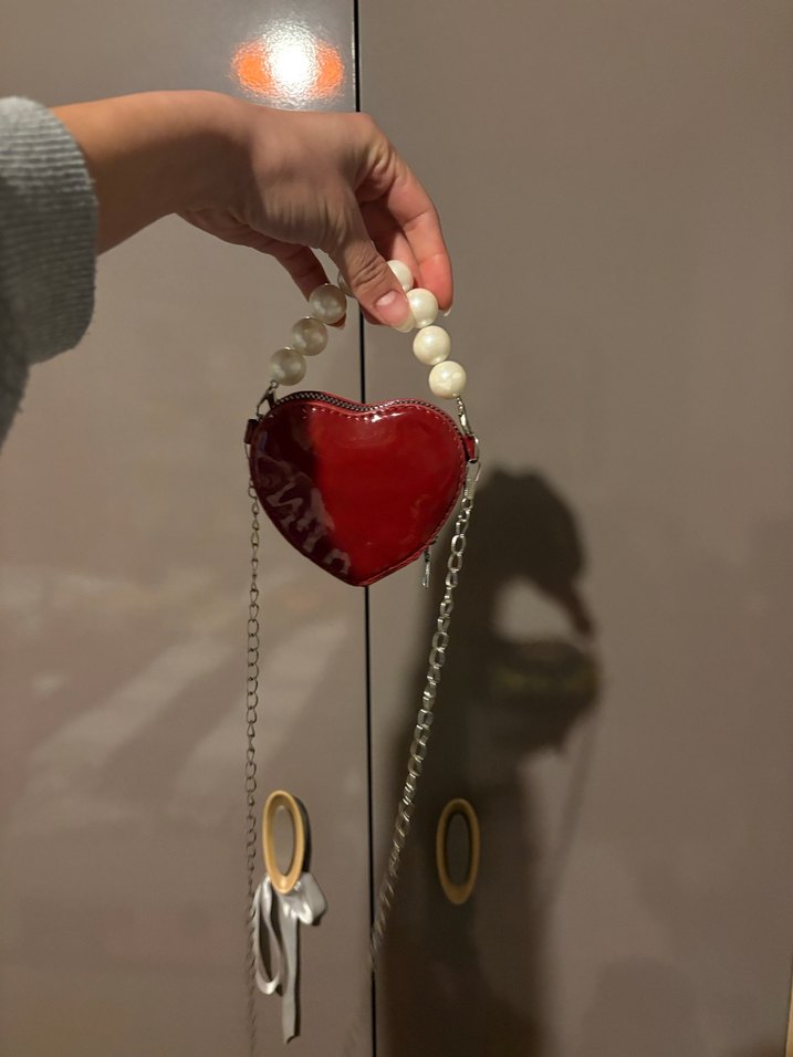 İnci saplı, işlemeli detaylara sahip parlak kırmızı seramik kalp şeklinde çanta, romantik akşamlar ve Paris tarzı için uygun.