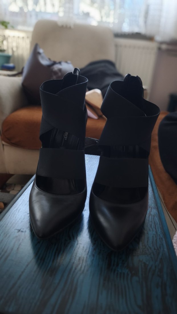 Siyah deri kadın botları, stiletto topuklu ve tokalı kayışlı, desen içermeyen şık tasarımla ofis için uygun goth tarzı.
