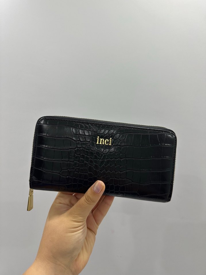 Siyah deri yılan desenli, fermuarlı kadın cüzdanı. İnci markalı, klasik şıklık ve iş ortamı için uygun.