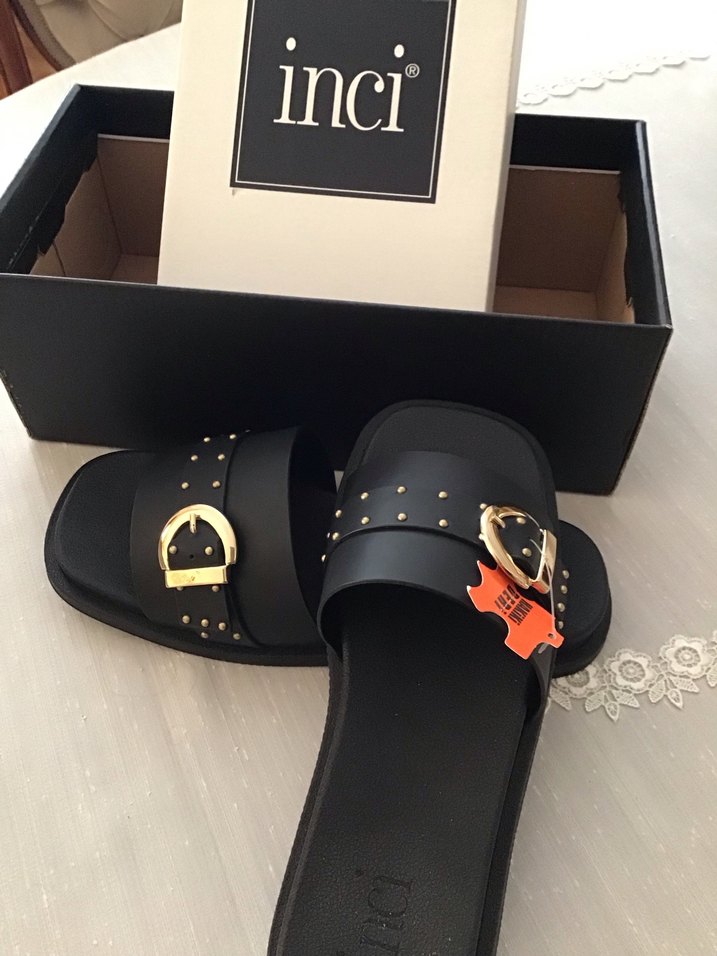 İnci markasına ait siyah tokalı, blok topuklu kadın terlik. Kauçuk malzemeden, minimal ve günlük kullanıma uygun. Yeni aldım büyük geldi ondan satıyorum orijinal kutulu