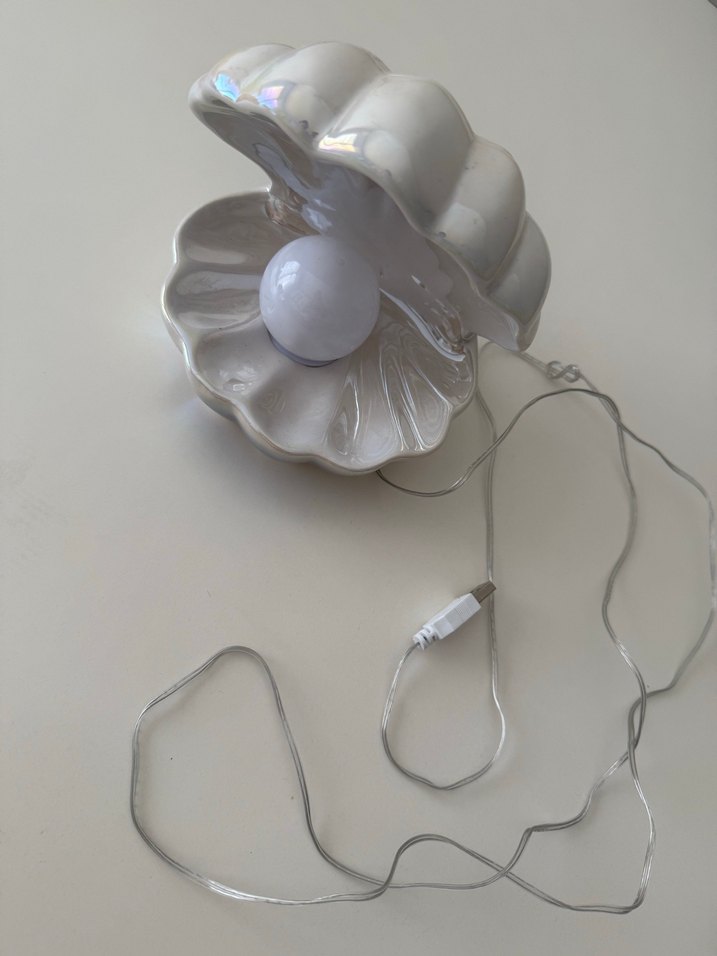 İnci şeklinde tasarlanmış beyaz masa lambası, parlak ve pürüzsüz yüzeye sahiptir. Kolay kullanım için açık renk kablo ve anahtarı bulunur.