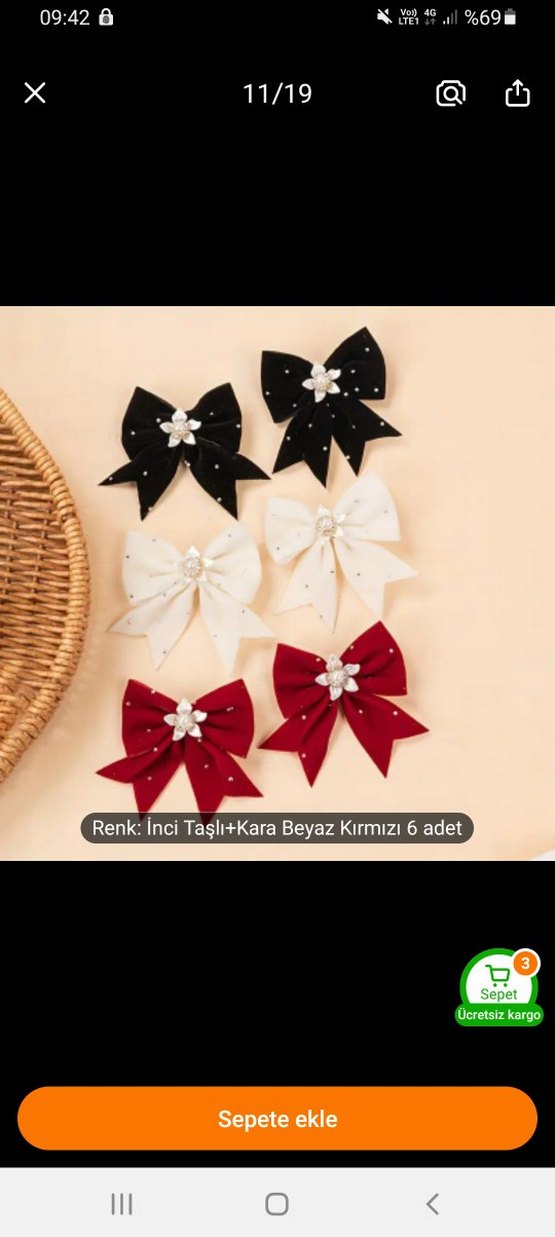 Siyah, beyaz ve kırmızı renklerde, sentetik kumaştan yapılmış, inci taşlı 6'lı vintage tarzda fiyonk seti.