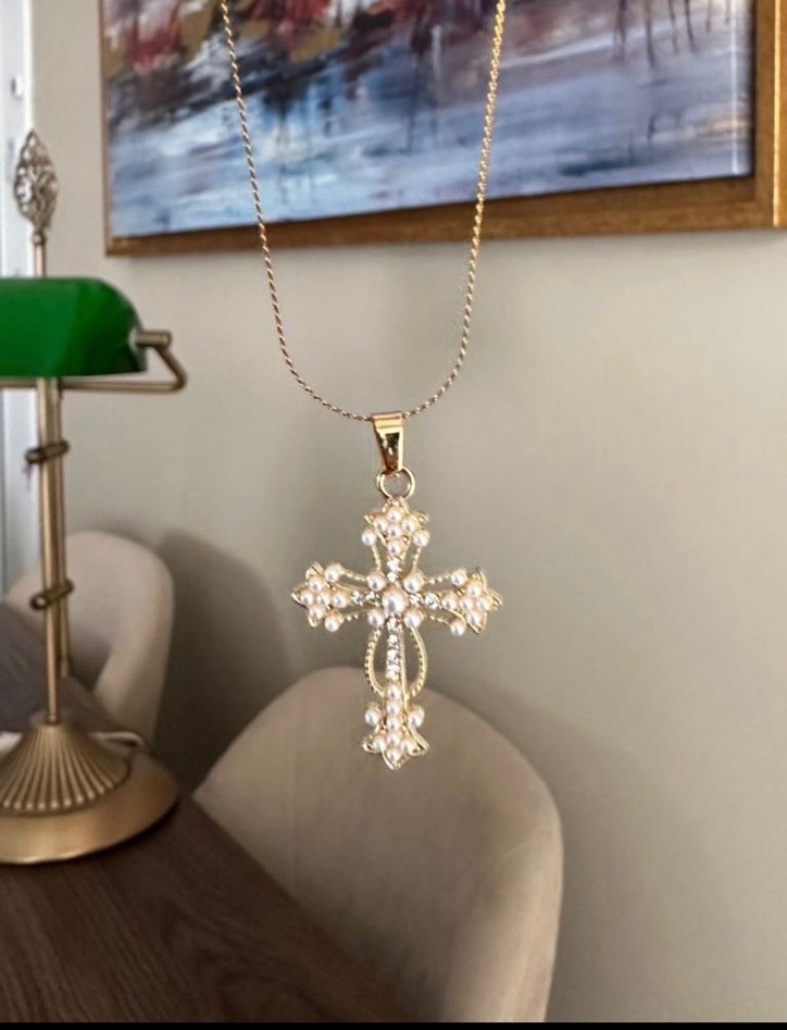 İnci Taşlı Haç Kolye