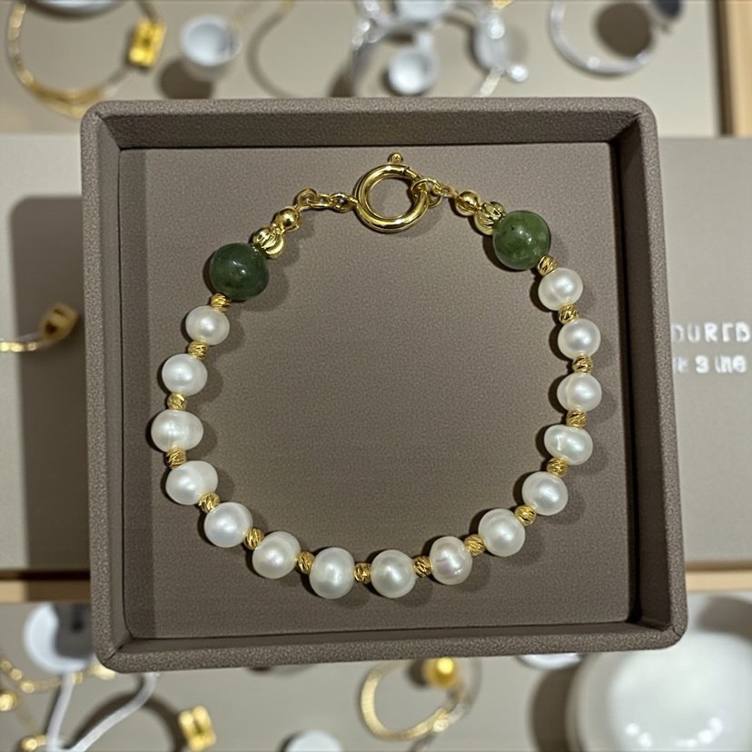 İnci ve yeşil boncuklarla bezenmiş, altın detaylı kadın bilekliği. Minimalist ve şık tasarımıyla romantik akşamlar için uygundur. Yeşim taşı kullanılmıştır. Altın kaplama dorika ve gemici kilit kullanılmıştır.
