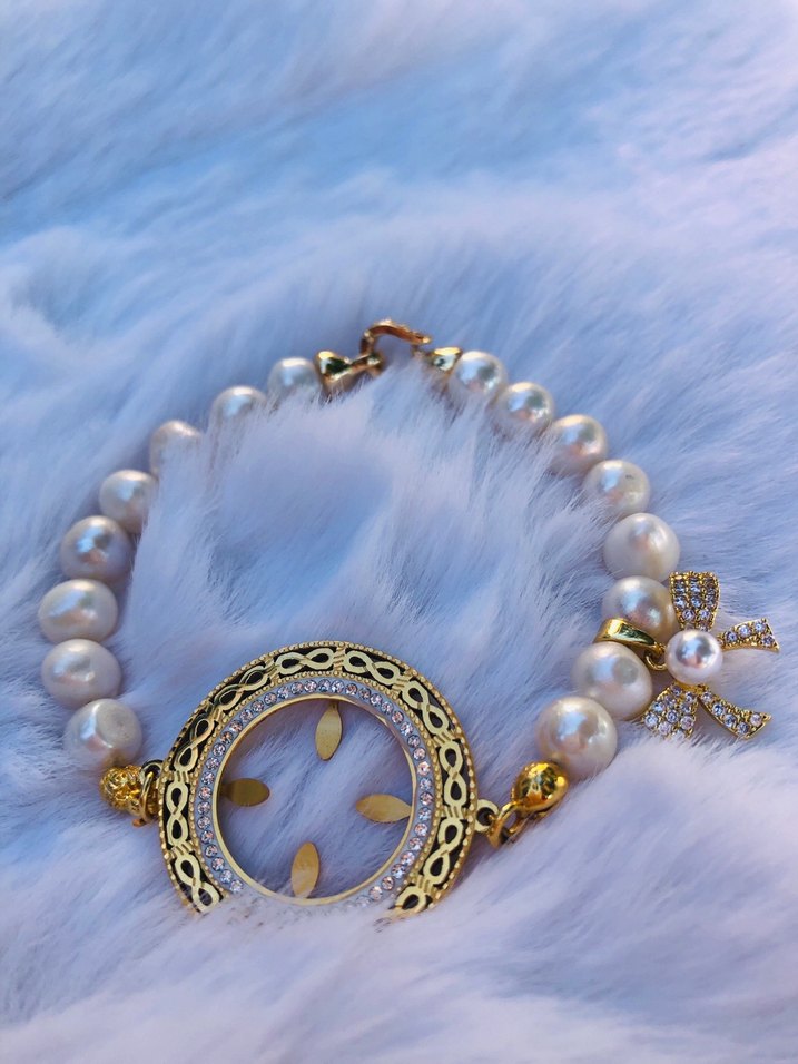 İnci boncuklar ve altın işlemeli detaylara sahip, bohem tarzda hafif altın renkli kadın bilekliği. Günlük kullanıma uygun süslemeli aksesuar ve toka içerir. ✨