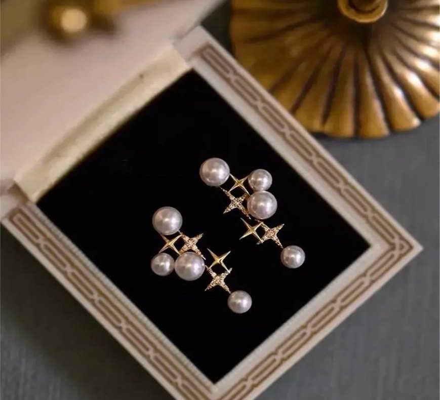 Altın renkli, işlemeli yıldız desenli ve boncuklu inci detaylı kısa uzunlukta küpeler, düğün ve klasik zarafet için uygun. ✨