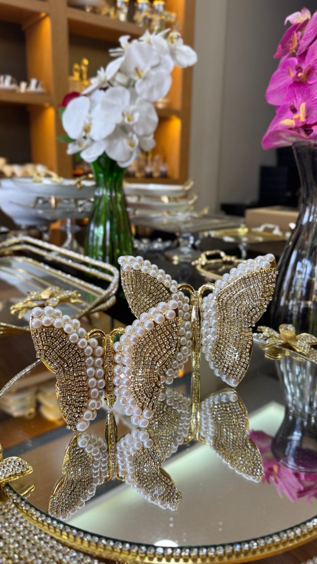 Altın renkli cam boncuklar ve inci detaylarıyla kelebek şeklinde bohem tarzda saç tokası, klasik zarafet katar.