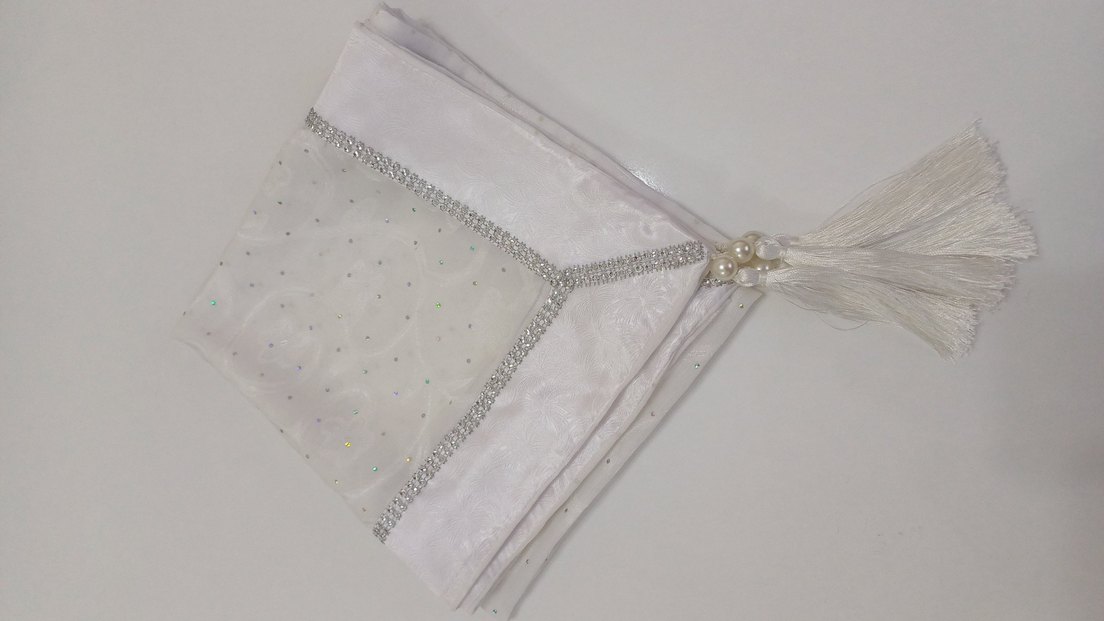Boncuklu ve inci detaylı beyaz örtu, klasik ve zarif bir tarz sunar. ✨