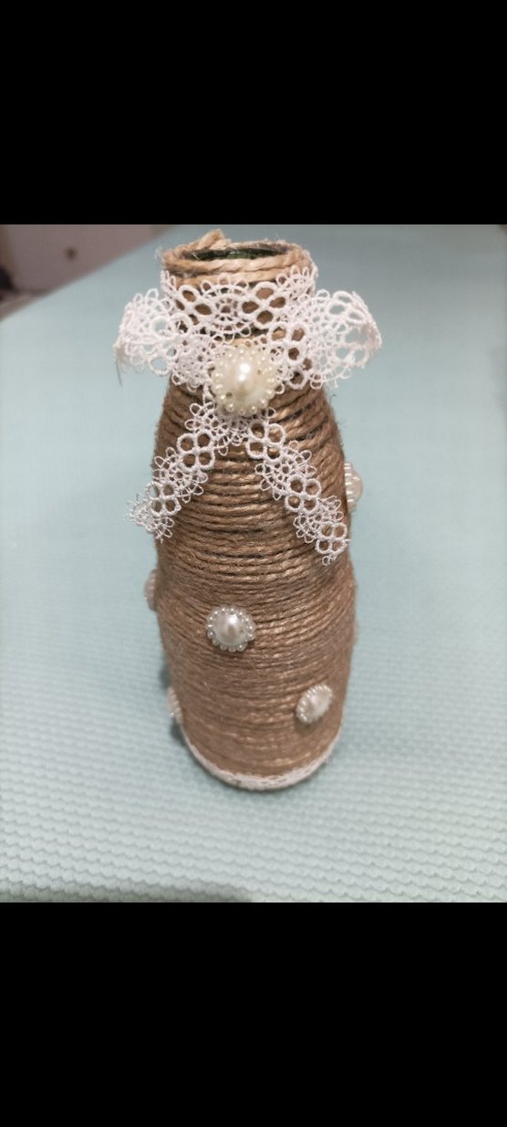 Doğal iplikle sarılmış, inci ve dantel detaylarıyla süslenmiş bej vazo.