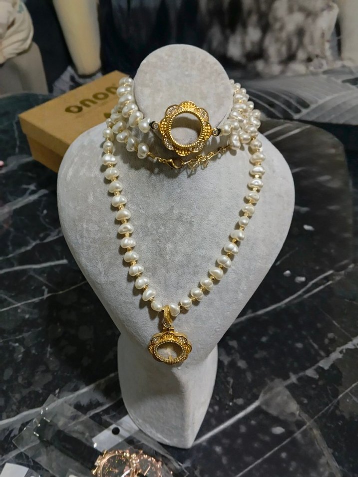 Parlak dorika işlemeli detaylar ve inci görünümlü boncuklardan oluşan uzun boy kolye, bohem tarzı ve düğünler için uygun.