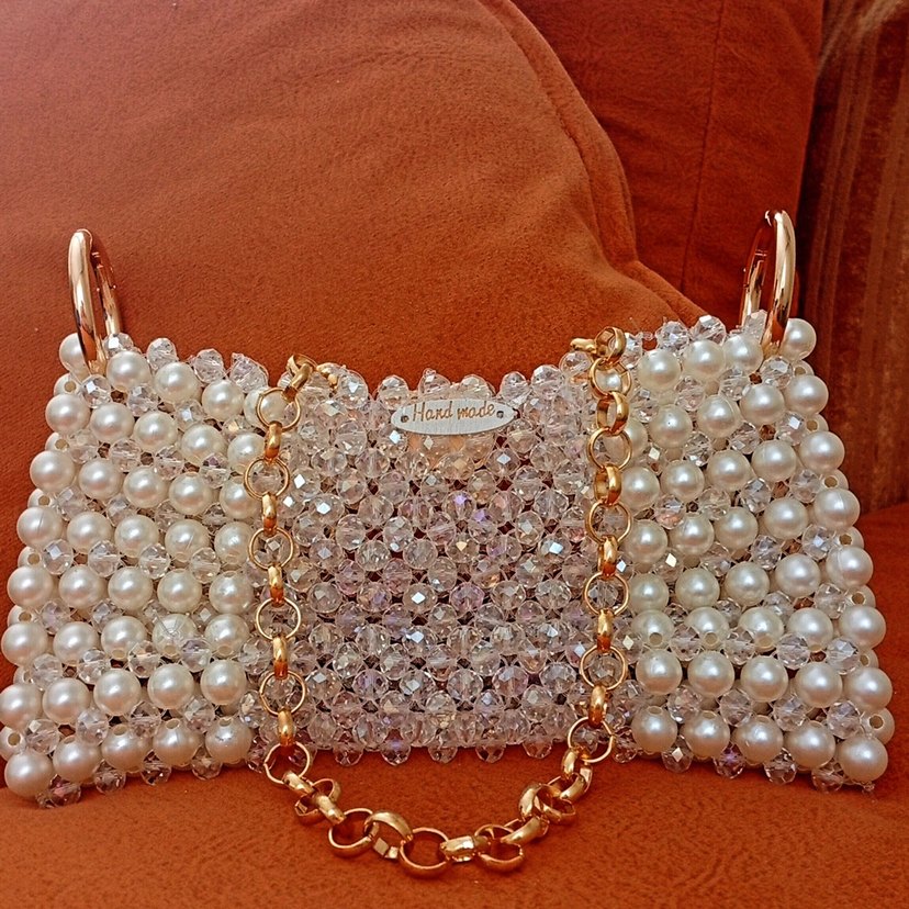 İnci ve kristal işlemeli beyaz örgü çanta, altın zincir askıya sahiptir. Bohem tarzda, klasik zarafetle düğünler için uygundur.