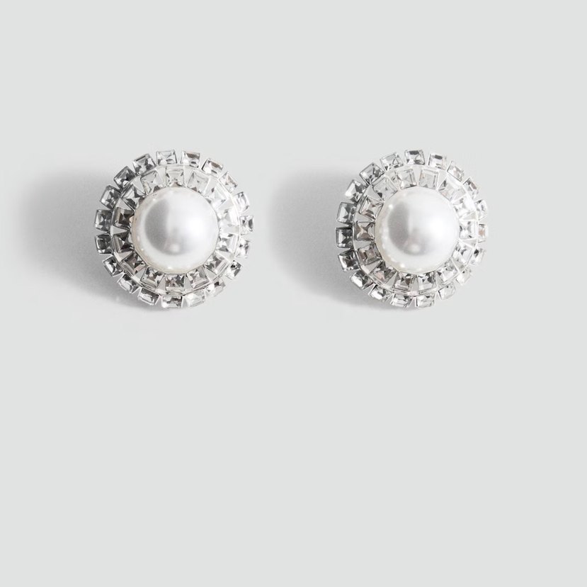 Orta uzunlukta, inci ve taş detaylı, nakışlı tasarıma sahip midi küpeler. Düğün ve özel etkinlikler için uygundur.