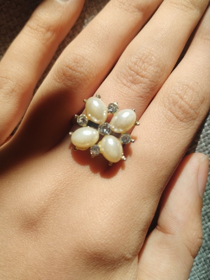 Beyaz renkli bu kadın yüzüğü, inci ve taş detaylı vintage çiçek desenine sahiptir, düğün ve bohem tarzı için uygundur.