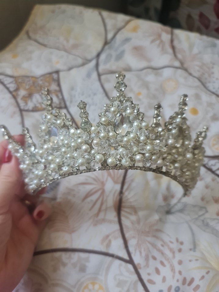İnci ve taşlarla süslenmiş beyaz gelin tacı, klasik ve gösterişli bir görünüm sunar. Geleneksel gelin stiline uygundur.