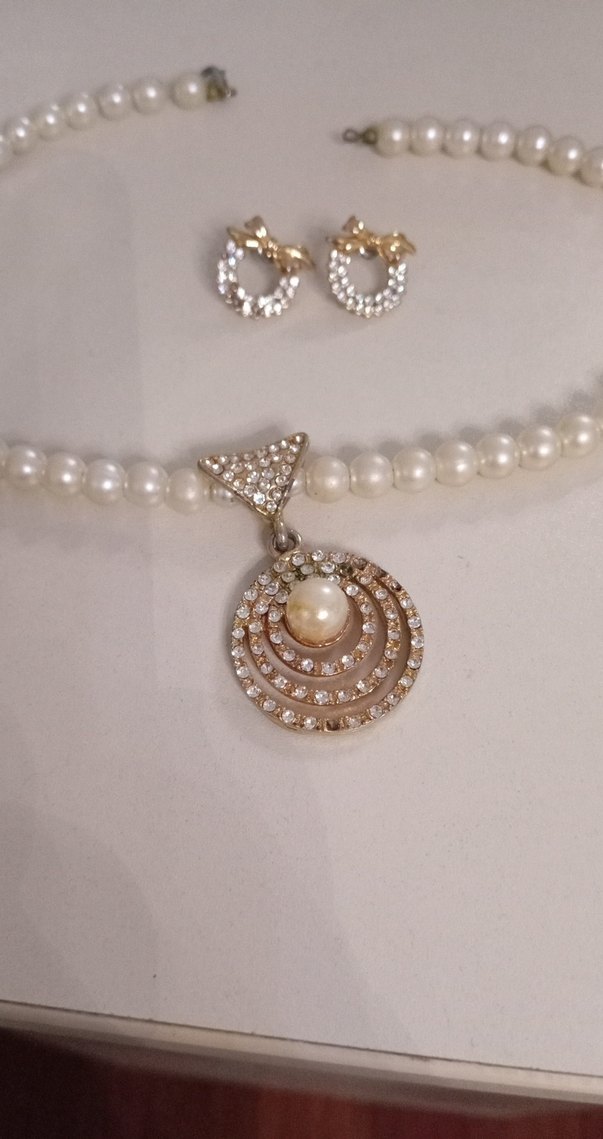 İnci ve taş işlemeli kolye ile uyumlu taşlı küpelerden oluşan kadın takı seti. Düğünler için uygun.