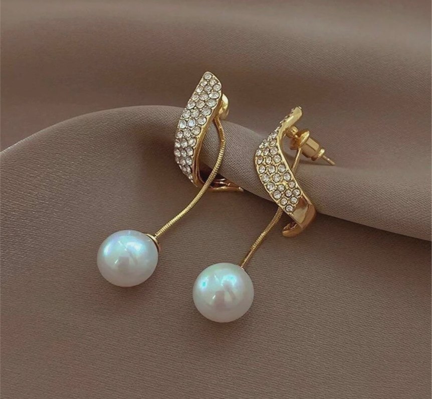 Parlak taşlarla süslenmiş mini uzunlukta altın küpeler, inci detaylarıyla klasik ve şık bir görünüm sunar. ✨