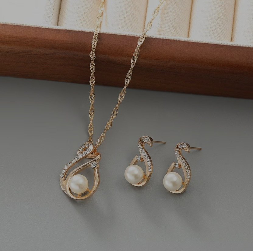 İnci ve boncuk detaylı, yılan deseniyle süslenmiş altın renkli, düğünlere uygun şık takı seti. ✨