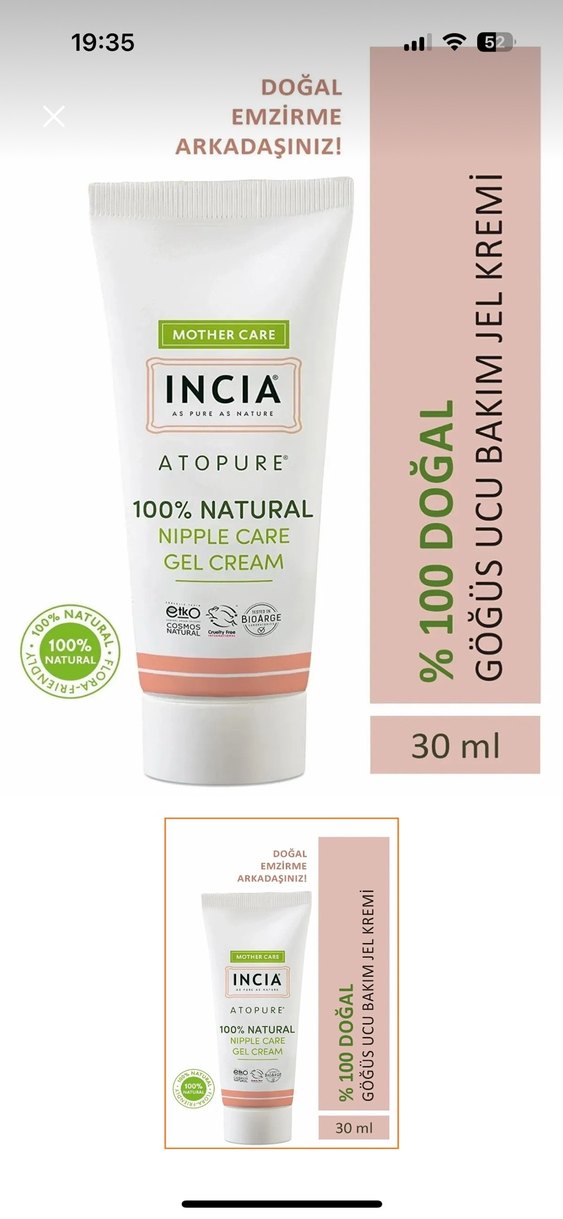 INCIA Atopure %100 doğal içerikli, göğüs ucu bakımı için jel krem, 30ml hacminde, nazik ve doğal bakım sağlar. Açtım ama emmediği için kullanmadım ihtiyacım olmadı. Elimde çok fazla yenidoğan ürünü var takipte kalın. Mesaj atabilirsiniz.