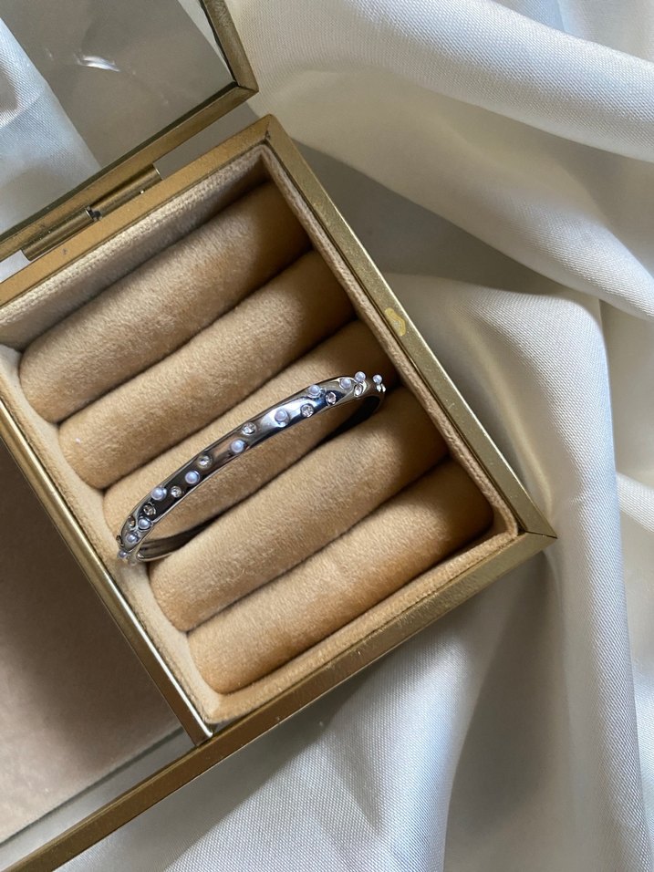 Beyaz inci işlemeli, çağdaş tarzda kadın bileklik. Silver detaylı ve şık modeliyle düğün için uygun şık bir aksesuar.