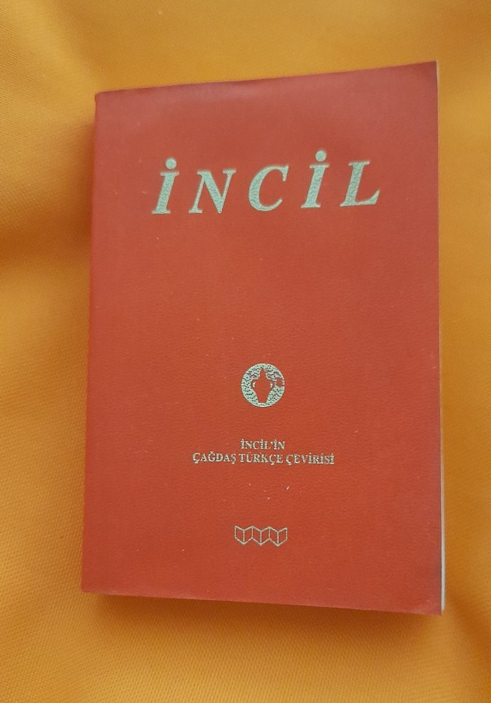 Çağdaş Türkçe çeviri ile İncil, kırmızı kapaklı kitap.
