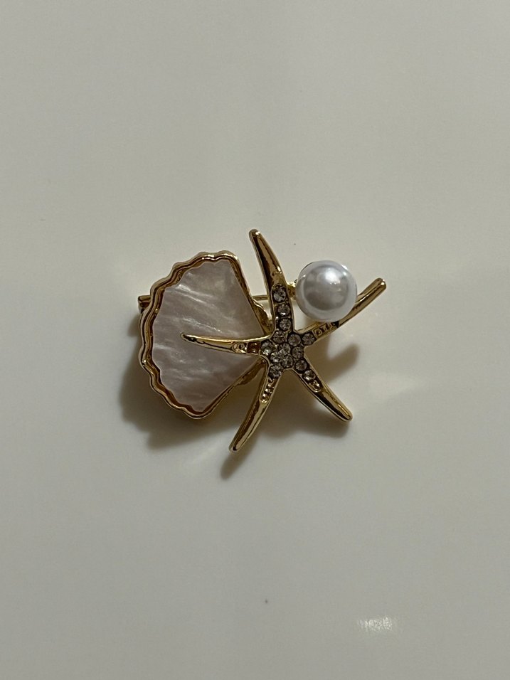 Bu altın broş, incili deniz yıldızı tasarımı, inci ve kabuk detayı ile bohem tarzı ve hafif nakışı bir araya getiriyor.