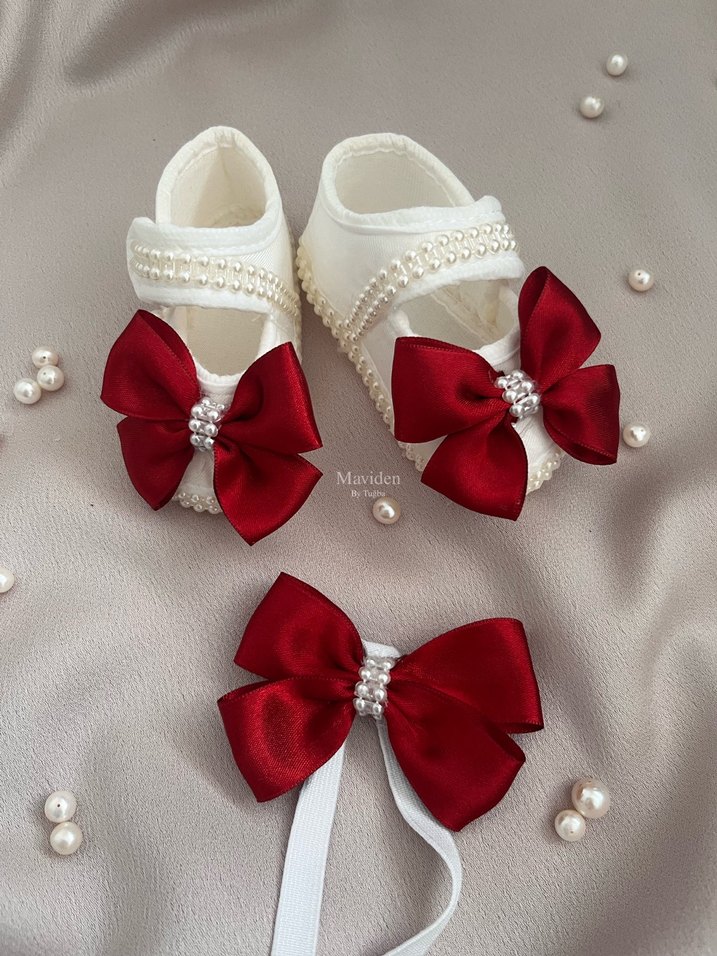 Beyaz, saten kumaştan kız çocuk ayakkabıları, işlemeli detaylar ve inci süslemeli canlı kırmızı fiyonk ile klasik ve renkli şıklık sunar.