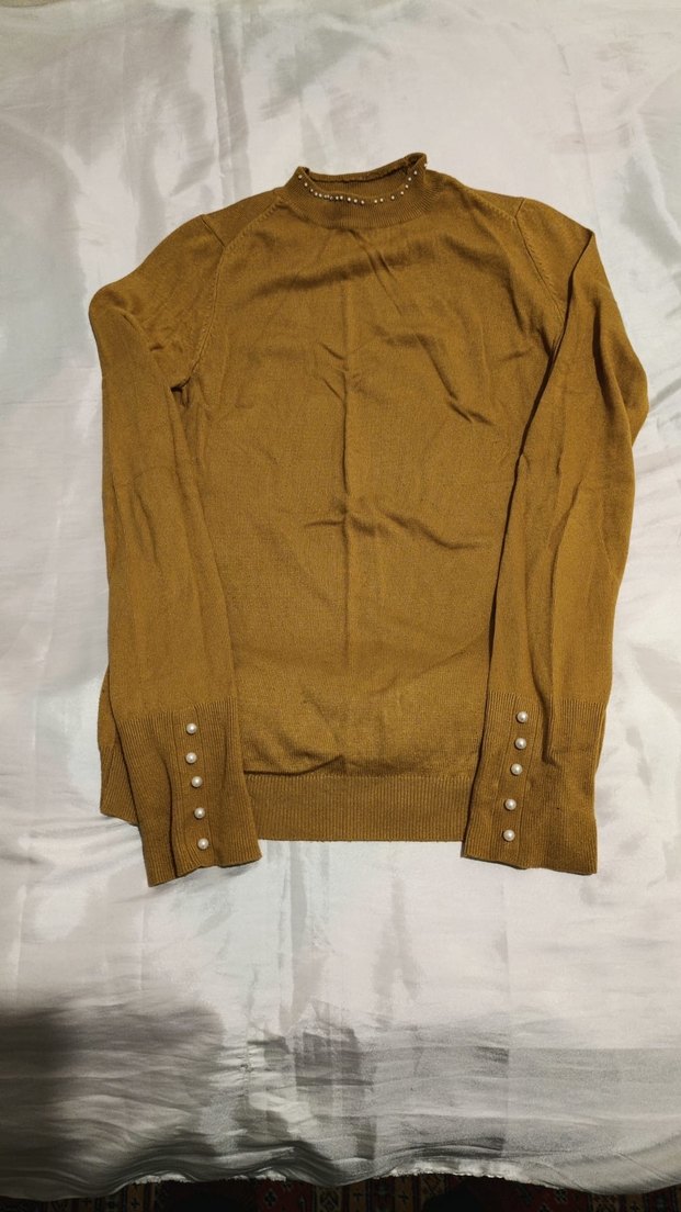 Düğmeli kol detaylı, boğazlı ve bej renkli, parlak görünümlü, normal midi uzunlukta, kadın triko kazak. Rahat ve şık sokak stili için uygundur. Sorunsuzdur s-m uyumlu