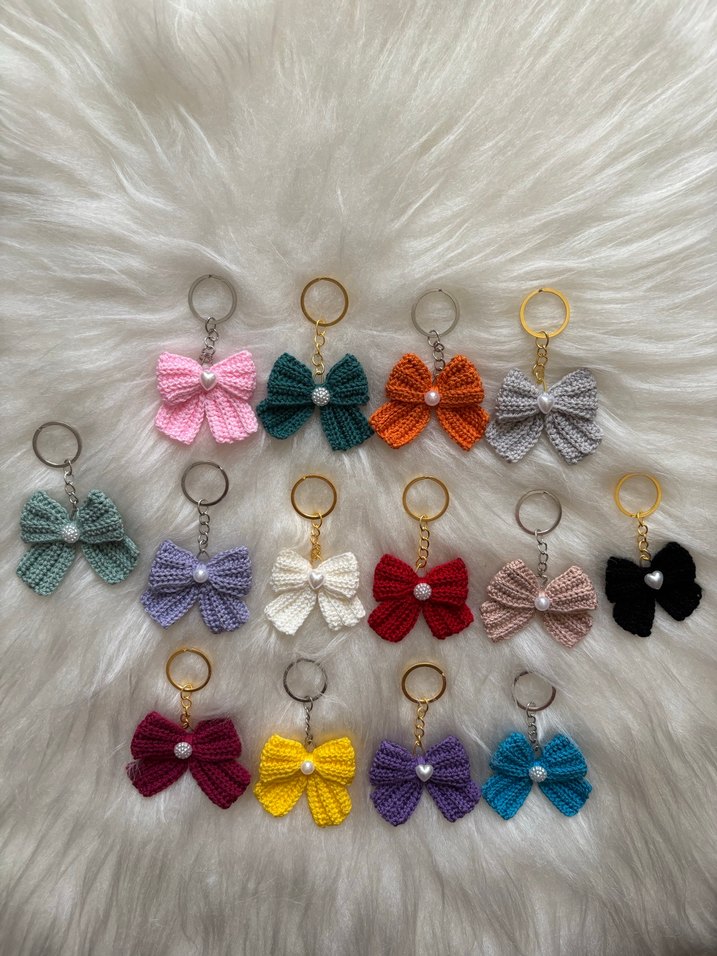 Renkli, rahat kumaştan yapılmış fiyonk anahtarlıklar. Her biri ortasında inci detayı bulunan sade ve bohem tarzda anahtarlıklar. Adet 21 tl